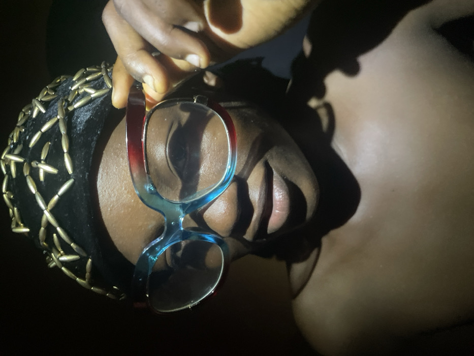 A person with dark skin poses in dim lighting. They wear a dark cap adorned with cross-patterned gold beads. The person's hand holds up a pair of eyeglasses with frames that transition from red at the top to blue at the bottom. The glasses obscure part of their face. Shadows define the features, including the nose, lips, and part of the chest. The photo is taken from a low angle, with the subject looking down.