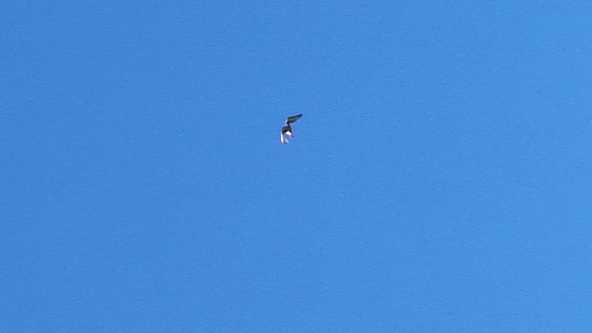 A bird is flying in a clear blue sky