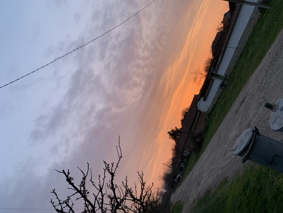 This image depicts a rural street scene in Lehchevo, Bulgaria, at sunset or sunrise. The sky dominates the upper portion, exhibiting a gradient from light blue at the zenith, transitioning through shades of purple and pink, to a prominent orange and red hue above the horizon. Streaky, scattered clouds are visible across the sky. In the immediate foreground, two cylindrical metal containers, identified as possible refuse bins, are positioned on a dirt road. The container on the left features a domed lid. The dirt road extends diagonally from the lower-left to the mid-right of the frame. Green grass patches border sections of the road. A bare deciduous tree, devoid of leaves, occupies the upper-left quadrant, its dark branches silhouetted against the colorful sky. A line of dormant trees or bushes runs along the left side of the road in the midground. On the right side of the road, a series of single-story structures with red-tiled roofs and light-colored walls are visible, extending into the midground. Perimeter walls, some painted white, are present. A solitary conifer tree stands among these structures. Additional bare trees are silhouetted against the bright horizon. A thin, dark utility line or power cable traverses the upper-right quadrant of the sky diagonally. No individuals are present, and no discernible actions or interactions are depicted within the frame. The lighting suggests a low sun angle, illuminating the scene with warm, soft light.