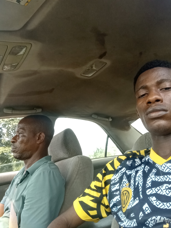 Two men are inside a car. An older man with a gray-green shirt is seated in the back, looking out the window. A younger man in a black and yellow patterned shirt is in the front, facing the camera. The car's ceiling is stained and has lights. The car is in motion as greenery passes by outside.