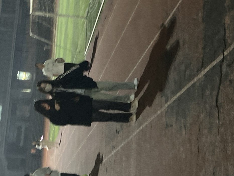 The image depicts an outdoor sports facility at night in Jiangjin, China. The foreground features a red-brown running track with white lane markings, exhibiting some surface cracks. Two individuals stand centrally on the track. The left person, with long dark hair, wears a dark long-sleeved top, dark pants, and light-colored shoes, with their right arm extended forward, pointing towards the right. The right person, also with long dark hair, wears a white face mask, a dark jacket with white arm stripes, light-colored pants, and white shoes, and appears to be linked by the left arm with the first individual. Both central figures cast long, dark shadows to their right onto the track. In the mid-ground to the right, a third person in a white t-shirt and dark pants walks while holding a light-colored ball. A green artificial turf soccer field is visible behind the track, with a white metal soccer goal frame partially seen on the right side of the field. A multi-story building with illuminated rectangular windows is present in the far background. Additional blurry figures are visible in the mid-ground walking on the track to the left. The scene is illuminated by artificial light sources, creating strong shadows.