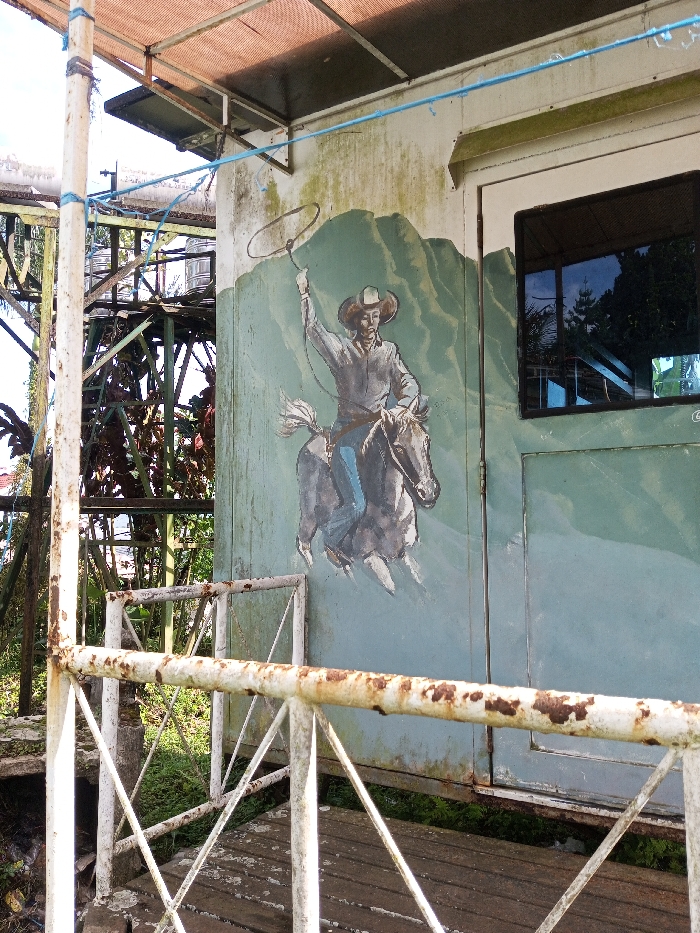 A faded mural depicts a cowboy riding a horse with a lasso raised against a mountain backdrop. The artwork is on a weathered, light green building with a window showing tree reflections. A rusted white railing runs along a wooden platform. A metal tower structure is partially visible to the left, entangled with foliage. The scene evokes a rustic, somewhat neglected outdoor setting.