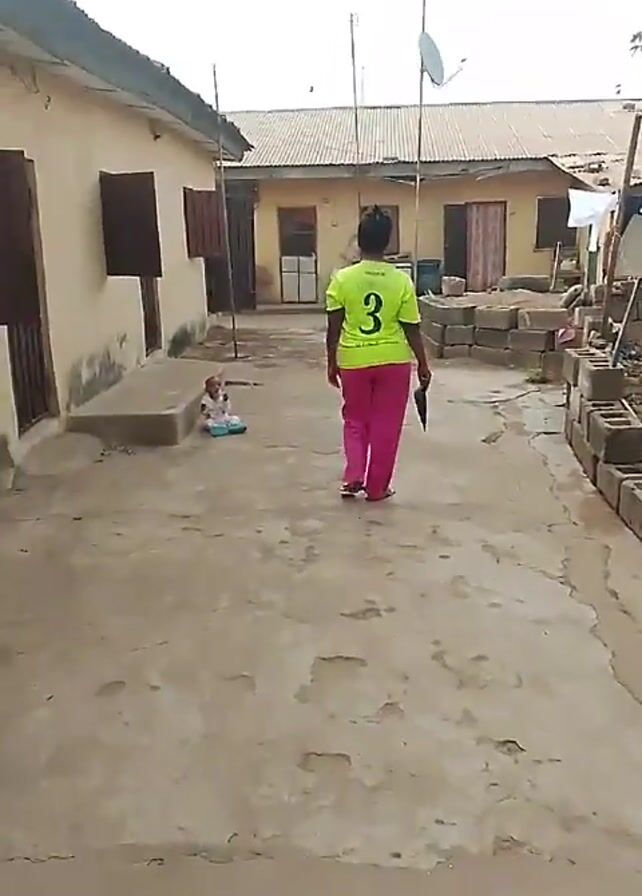 A woman wearing a green jersey with the number 3 on the back and pink pants is walking away from the camera down a paved courtyard. To her left is a light-colored building with brown trim. Seated on the ground to the left of the courtyard, is a baby in a white outfit and blue shoes. To the right of the courtyard are piles of cinder blocks and a light-colored building with a tin roof. The sky is overcast.