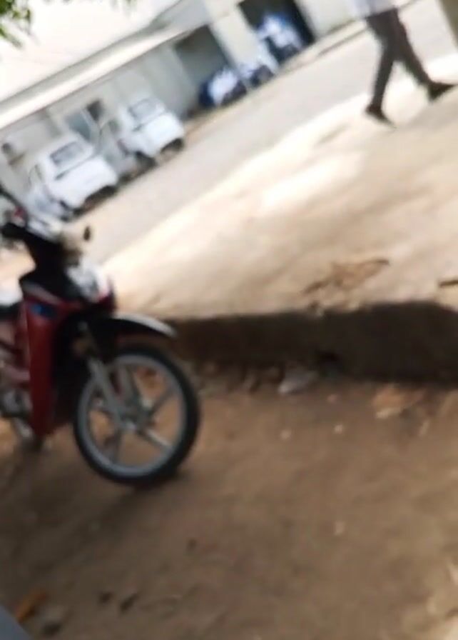 A person is seated outside, with a view of a red and black motorcycle parked nearby. The ground is dirt, and there is a small wall-like structure next to the seated person. In the background, several men in white shirts are conversing under a tree. A red car is parked close to the tree. A building with multiple white vans parked in front of it is visible in the distance. The scene is shot from the seated person's perspective, with a sheet of paper visible in the foreground.
