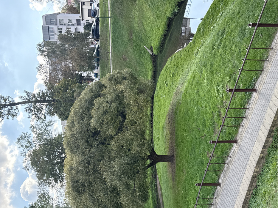 The image displays an urban park scene in Hrodna, Belarus, captured during daylight under a partly cloudy sky. In the foreground, a light-colored paved walkway, constructed from rectangular pavers, runs diagonally from the lower left toward the center. A dark brown metal railing with decorative vertical posts borders the walkway, separating it from a sloped, grass-covered embankment. The midground features a large, solitary deciduous tree with a dense, rounded canopy of dark green leaves, situated on a small grassy rise. Adjacent to the tree, a narrow, dark-water stream flows from left to right, bordered by steep, uniformly grassed banks. A fallen log or branch lies partially submerged on the stream's far bank. Beyond the stream and embankment, a paved road is visible, occupied by at least three vehicles: a dark green sedan, a black SUV, and a white car. The background includes a multi-story building, light in color with a grey roof and visible window lines, partially obscured by numerous trees of varying heights and foliage. The sky above is characterized by distinct white cumulus clouds against a pale blue background. No individuals are present in the scene.