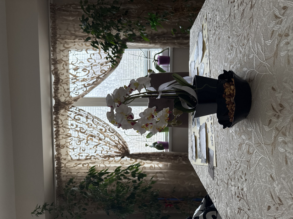 An interior scene in Varna, Bulgaria, depicts a room with a large window as the focal point. In the immediate foreground, a table is covered with a light-colored tablecloth featuring a subtle, repetitive leaf or vine pattern. On the table, slightly right of center, a black square pot contains an artificial white orchid plant with multiple blooms and a white ribbon tied around its stem. Directly in front of the orchid, a small black bowl with a scalloped edge holds a quantity of assorted nuts. To the left on the table, several light-colored placemats or papers are visible. The top left corner shows a portion of a chair with a black and white geometric pattern. The midground is dominated by a large window covered by light brown, sheer curtains with a patterned design, tied back to reveal the outside. Tall, leafy green potted plants, possibly ficus trees, flank the window on both the left and right sides. On the windowsill, two smaller potted plants are discernible, one in a purple pot on the right and another in a lighter-colored pot on the left. The window provides natural backlighting, silhouetting some interior elements and showing an indistinct outdoor environment through the panes. No individuals are present in the image.