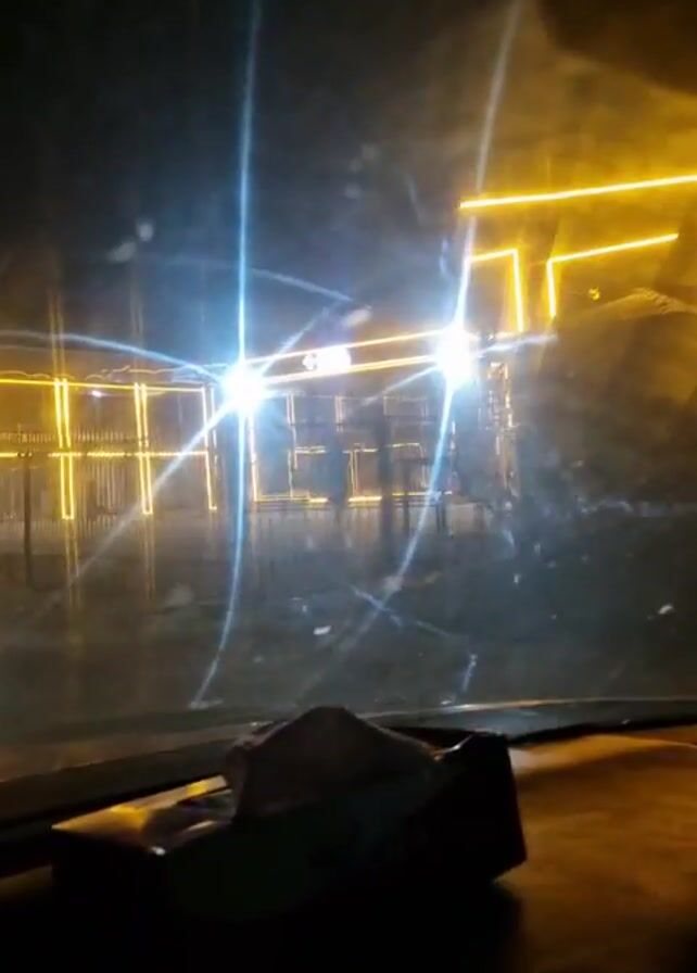 drive at night, presumably through a town. The camera is inside a car, pointed through the windshield. Bright yellow neon lights outlining a building are seen at the start, followed by the car driving past it. The street is wet. The camera then shows the car's dashboard, including the speedometer. The car's speed fluctuates, with the needle swinging around the 20 mph mark. Warning lights are illuminated on the dashboard. Other cars pass by in the opposite direction.