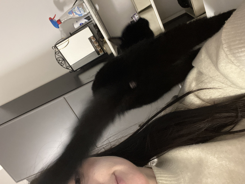 The image displays an indoor domestic setting. No visual identifiers or landmarks are present to determine its specific location within Rome, Italy, or any other city. The foreground features the upper-left portion of a person's face, including the left eye, nose, and mouth area, partially obscured by a black cat's tail. The person has long, dark hair and wears a light-colored, possibly cream or beige, knitted sweater. A faint smile is visible on the person's lips. A black cat is positioned prominently in the midground, its back and tail facing the viewer. Its long black tail sweeps diagonally from the upper-left to the mid-right, covering part of the person's face. A circular white highlight is visible on the cat's mid-body, possibly a reflection. The cat's head is turned to the right, looking towards the background shelves. The background consists of a plain light-colored wall, a large grey two-door cabinet or wardrobe, and a white shelving unit. On the shelving unit, from top to bottom, are a decorative black-framed mirror with ornate scrollwork, a transparent spray bottle with a red nozzle and blue liquid, other small white bottles, and light-colored storage boxes. The scene is captured from a close-up, first-person perspective.