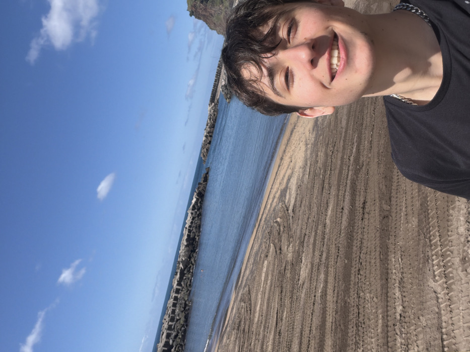 The image displays a young male taking a selfie on a beach in Calheta, Portugal, under clear, sunny conditions