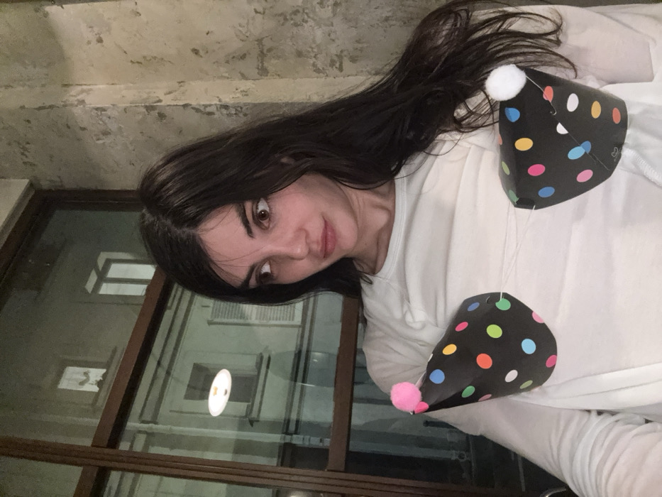 A woman with long, dark hair is seen in a selfie-style photograph. She is wearing a white, long-sleeved shirt. Two black party hats with colorful polka dots and white/pink pom-poms are dangling in front of her. The background includes a window reflecting a building across the street, with hints of a light fixture visible in the reflection. A textured wall is also visible.