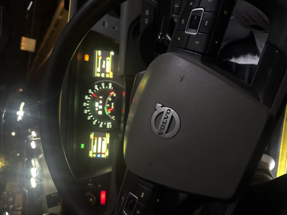 The image provides a driver's perspective from the interior of a Volvo truck or heavy-duty vehicle at night