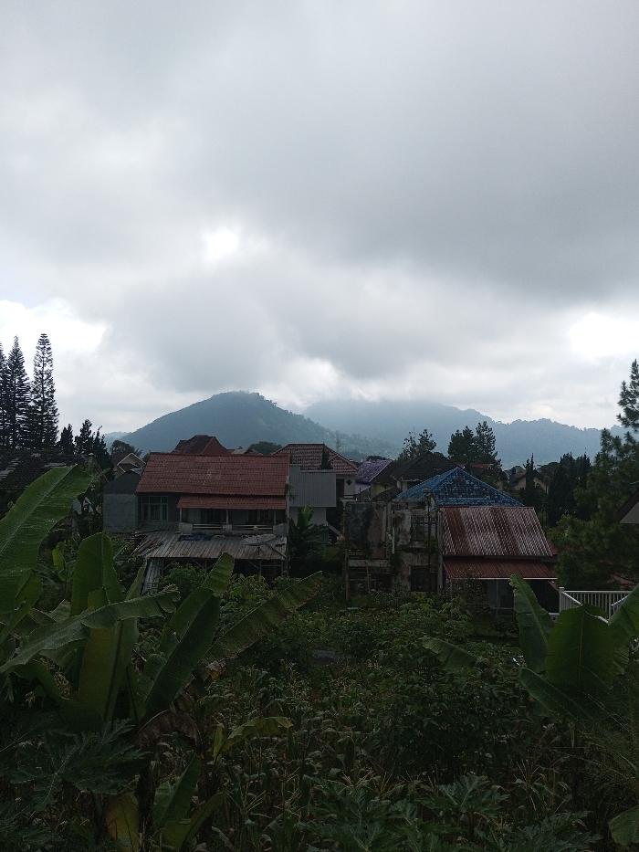 The image displays a residential landscape in Kondha, India, under an overcast sky dominated by thick grey clouds. The upper half of the frame features a large, forested mountain range partially obscured by mist or low clouds. The midground contains a cluster of houses nestled amidst dense vegetation. A multi-story house with a red-tiled roof and light-colored walls is prominent in the center-left. Adjacent to it on the right stands a dilapidated two-story structure with exposed concrete walls, partially visible framing, and a blue and rusty corrugated metal roof. Other residential buildings with varying roof colors (red, grey, purple) are visible further back. The foreground is heavily populated with lush green vegetation, including large banana plant leaves and various other shrubs and trees. Tall, slender pine trees are visible on the far left and right edges. No individuals or specific actions are discernible. The lighting is diffused, consistent with an overcast day.