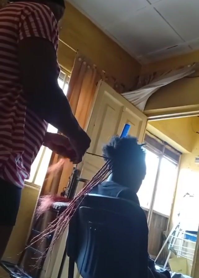 A low-angle shot captures two individuals inside a room. The room has yellow-painted walls and a white ceiling with visible water stains. A person wearing a red and white striped shirt and dark shorts stands, facing slightly away from the camera and toward another person sitting in a black office chair. The seated person has dark hair, a blue hair clip securing part of it. The standing person holds long red extensions and appears to be braiding the seated person's hair. Light streams in through a window behind the seated person, illuminating the room with a yellow glow. A tan curtain hangs near the window. A white door is partially visible next to the seated person. In the foreground, a small black stool is placed near a door. The overall lighting is somewhat dim, causing the seated person to appear as a silhouette.