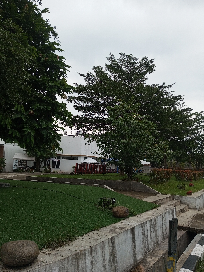 The scene depicts an outdoor environment in Cianjur, Indonesia, under an overcast sky. In the foreground, a rough concrete retaining wall runs horizontally, featuring a dark drainage channel with black and yellow striped posts. Two large, smooth, rounded boulders are positioned on the concrete and a patch of vibrant green artificial turf to the left. A small, dark metal cage rests on the artificial turf near the center. The midground features an elevated landscaped area with natural grass and several large deciduous trees, one prominently centered, another on the far left, and more in the background. A section of reddish-leafed shrubs is visible to the right. Concrete steps lead upwards from the foreground wall to the midground level. In the background, a multi-story white building with a flat roofline is visible. A dark railing runs along the rooftop. Attached to the left side of the building is a small, open-fronted kiosk or stall with a white canopy, displaying text suggestive of a coffee vendor. In front of the building, centrally located in the midground, is a large, three-dimensional sculpture or sign constructed from red-stained wooden blocks, accompanied by a white patio umbrella. No individuals are discernible in the image.