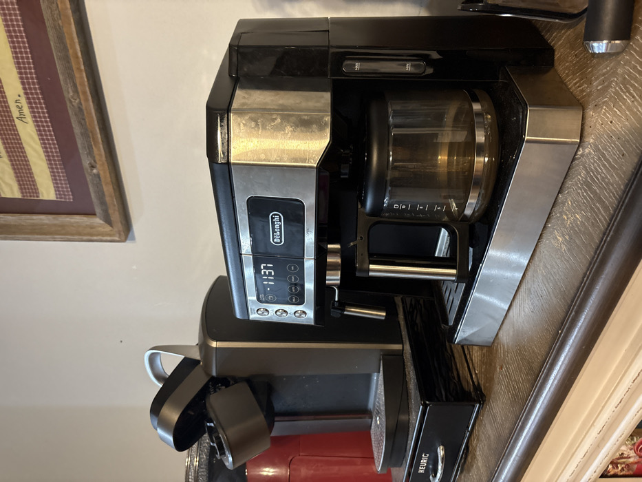 A black and silver Delonghi coffee maker is positioned on a patterned surface. The digital display reads "11:37". The coffee maker appears slightly dusty. A black Keurig machine is situated below and partially obscured. A framed item hangs on the wall to the left, displaying a patterned fabric with visible stitching and the words "Amen". The angle of the photo gives the impression that the objects are tilted.