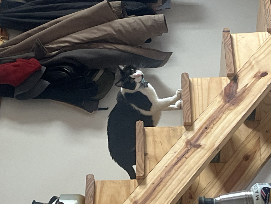 A black and white cat stands on a wooden staircase, holding onto the side of a step