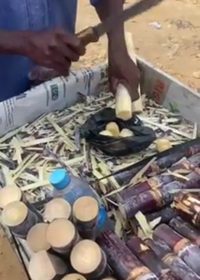 A vendor is chopping sugarcane