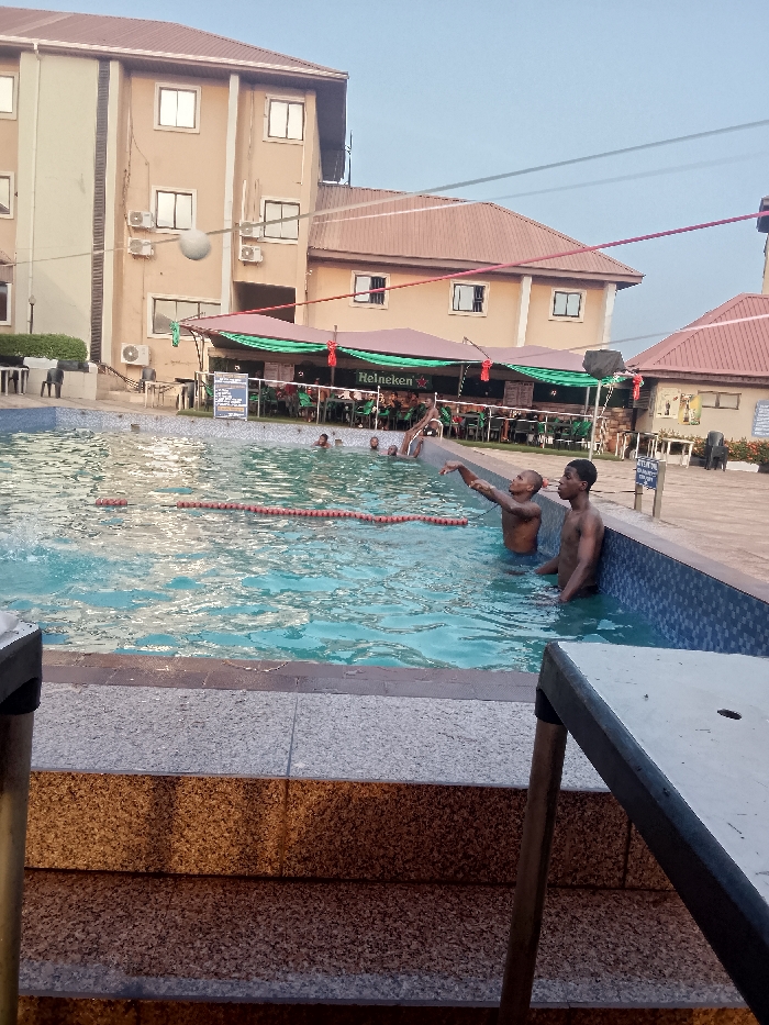 - "This image captures an outdoor swimming pool area within a leisure facility in Onitsha, Nigeria, under a clear, light blue sky, likely during late afternoon" by FM-Zqunh1, licensed under CC BY 4.0