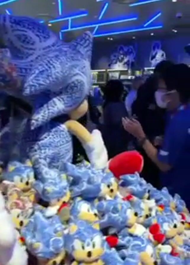 interior of a store decorated with Sonic the Hedgehog merchandise, with blue lights on the ceiling. The first shot focuses on a large collection of Sonic plush toys, including ones with floral patterns. The next shot pans across the store, showing more people browsing through the merchandise. A large statue of Shadow the Hedgehog is displayed on a table, surrounded by more plush toys. A person wearing a white hat stands in front of the statue. The final close-up shot focuses on Shadow’s face.