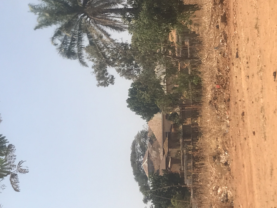 The image displays a daytime view of a residential area in Miango, Nigeria, under a clear, light blue sky. In the immediate foreground, reddish-brown soil is visible, indicative of an unpaved surface, with scattered dry, light brown vegetation and minimal litter. The midground features denser patches of dried, yellowish-brown grass and plant stalks. Behind this, a concrete or block wall structure, partially overgrown with dry vegetation and some green foliage, separates the foreground from the cluster of buildings. The background reveals multiple single-story structures. Several buildings exhibit rounded or conical roofs, possibly thatched or made of similar dry natural materials, while others feature silver-colored corrugated metal roofs. The walls appear to be constructed from earthen materials or concrete blocks. The buildings are interspersed with numerous trees and dense green foliage, including a prominent palm tree with dry fronds on the far right side of the frame. No individuals, animals, or specific activities are discernible within the scene.
