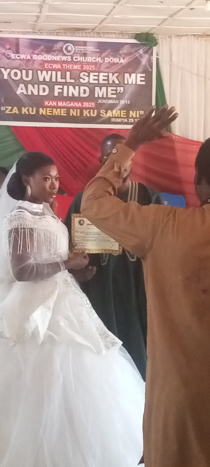 The image depicts a ceremony inside the ECWA Goodnews Church in Doma, Nigeria, as indicated by a prominent banner