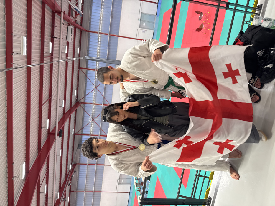 The scene is set indoors within a sports facility in Brumath, France, characterized by a high ceiling with exposed red structural beams, white corrugated panels, and fluorescent lighting. In the foreground, three individuals are positioned on an elevated platform, separated by a black railing from the main sports area. A male on the left, with dark curly hair, wears a white judogi and a gold medal on a red and white lanyard around his neck; he is barefoot. A female in the center, with long dark hair and sunglasses perched on her head, wears a black leather-style jacket over a dark green top, dark grey pleated trousers, and light-colored shoes; her right hand is slightly raised near her face. Her left arm rests casually over the shoulder of the male on the right. This male, with short dark hair, wears a white judogi, a green belt, a gold medal on a red and white lanyard, and black Adidas slide sandals. The two males are holding a large white flag of Georgia, which features a prominent red St. George's cross and four smaller red Bolnisi crosses in each quadrant, stretched horizontally across the frame below waist level. All three individuals are generally looking downwards towards the flag. The background shows sections of green and red sports mats. White walls with high windows are visible, along with two light-colored doors on the right side. Further back on the mats, two chairs with yellow markers are discernible. In the bottom right corner, a black Adidas duffel bag and a plastic water bottle rest on the floor.