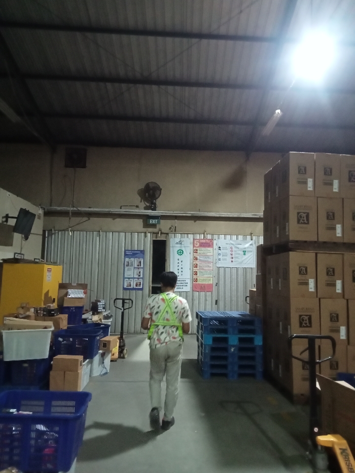 The image depicts the interior of a commercial or industrial warehouse facility. The specific city and country are undetermined. The environment features a corrugated metal ceiling, light-colored walls, and a concrete floor. Artificial overhead lighting, including fluorescent tubes and a bright, singular fixture, illuminates the scene. A single individual, an adult, is observed from behind, walking away from the camera towards a background exit. The person wears a light-colored, patterned short-sleeved shirt, light-colored trousers, dark shoes, and a neon yellow-green reflective safety vest or harness. On the right side of the frame, numerous brown cardboard boxes, each displaying an 'A' logo within a square, are stacked high. Several blue plastic crates and bins are visible in the left foreground and mid-ground, containing various items. A stack of blue plastic pallets is positioned in the mid-ground, to the left of the stacked boxes. Other objects include a yellow industrial cabinet, a wall-mounted monitor, and at least two hand pallet jacks (one partly visible on the far right foreground with "KORISSI" text, another further back on the left). The background features a corrugated metal partition or rolling door with an illuminated "EXIT" sign above it. Several informational and safety posters, including one with "SAFETY" vertically printed and another mentioning "5 LANGKAH," are affixed to this partition. Wall-mounted fans are also present above the partition.