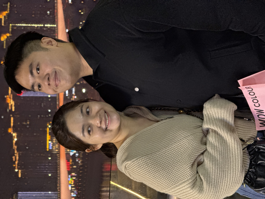 The image displays two East Asian individuals, identified as a male and a female, posing at night in an urban environment