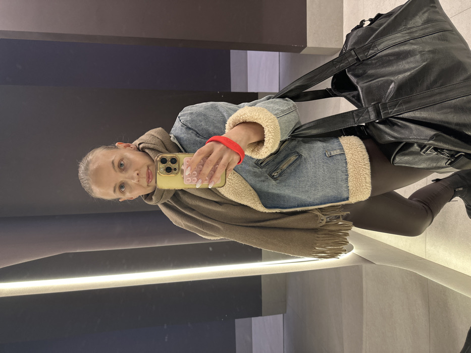 A woman takes a mirror selfie in what appears to be a commercial space. She's wearing a denim jacket with a sherpa lining, a brown scarf, and leggings with boots. She holds a yellow iPhone, and there's a red band on her wrist. A large black backpack hangs over her shoulder. The background includes architectural elements with a dark panel and a strip of light. The image is oriented vertically.