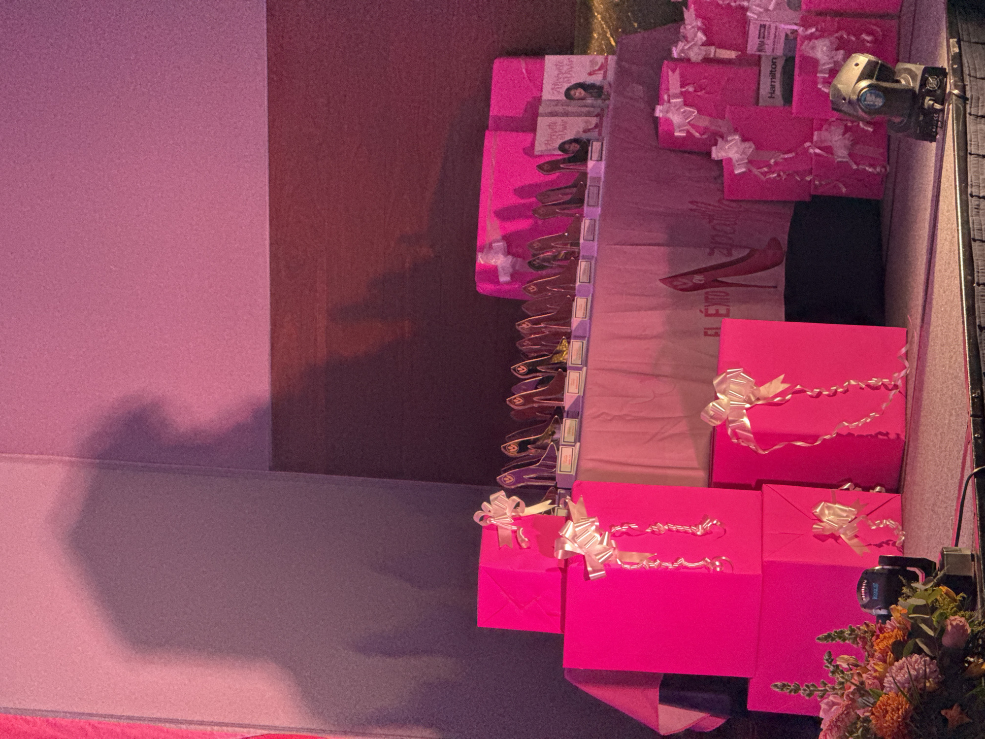 The image captures a scene from what appears to be an event, possibly a charity function or a celebration, in Mexico City, Mexico. The primary focus is on a collection of pink gift boxes, all tied with white ribbons, arranged on a table or platform. Some of the boxes have branding or text that is difficult to fully decipher but includes the word "Hamilton." Also on the table are rows of miniature, high-heeled shoe ornaments. The lighting in the scene suggests an indoor setting, perhaps a banquet hall or similar event space. The walls are pink and burgundy. There are flower arrangements on the table, as well as equipment that suggests lighting and audio set ups.
