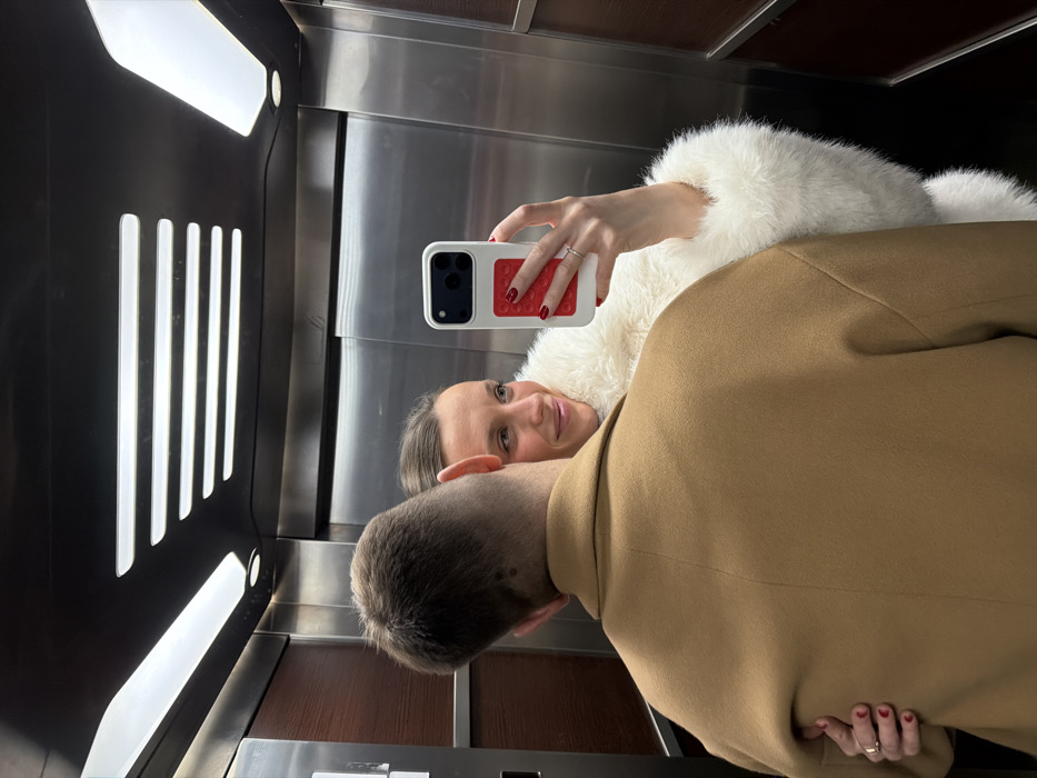 A woman in a white, furry jacket and a man in a tan overcoat are taking a selfie in an elevator. The woman is holding a phone with a white case and a red grip. The elevator has a stainless steel interior with dark panels, illuminated vertical lights, and a control panel. Both are wearing rings, and the woman has red nail polish. The photo appears to be taken in a mirror.