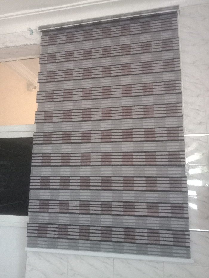An indoor scene in Tarauni, Nigeria, displays a window covered by a fully extended zebra-style roller blind