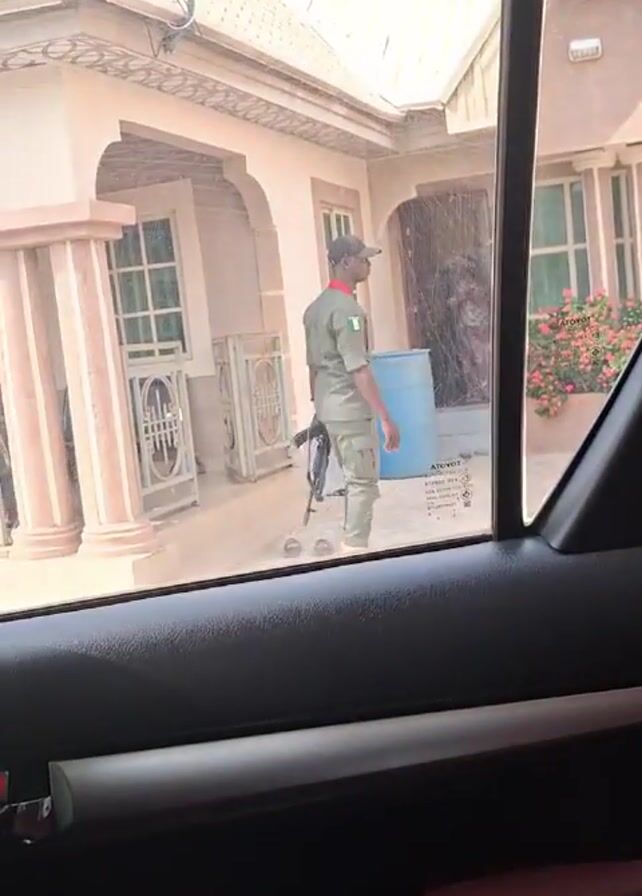 From the perspective of the back seat of a car, the video shows a man in a tan or light green uniform standing in front of a residential building. The man is wearing a cap and appears to be carrying a rifle. The building is a single-story house with a light-colored exterior, decorative columns, and bars over the windows. A blue barrel is visible behind him. The car's interior is visible in the foreground, including a gray armrest and a reddish-brown door panel. The scene appears to be outdoors during the daytime.