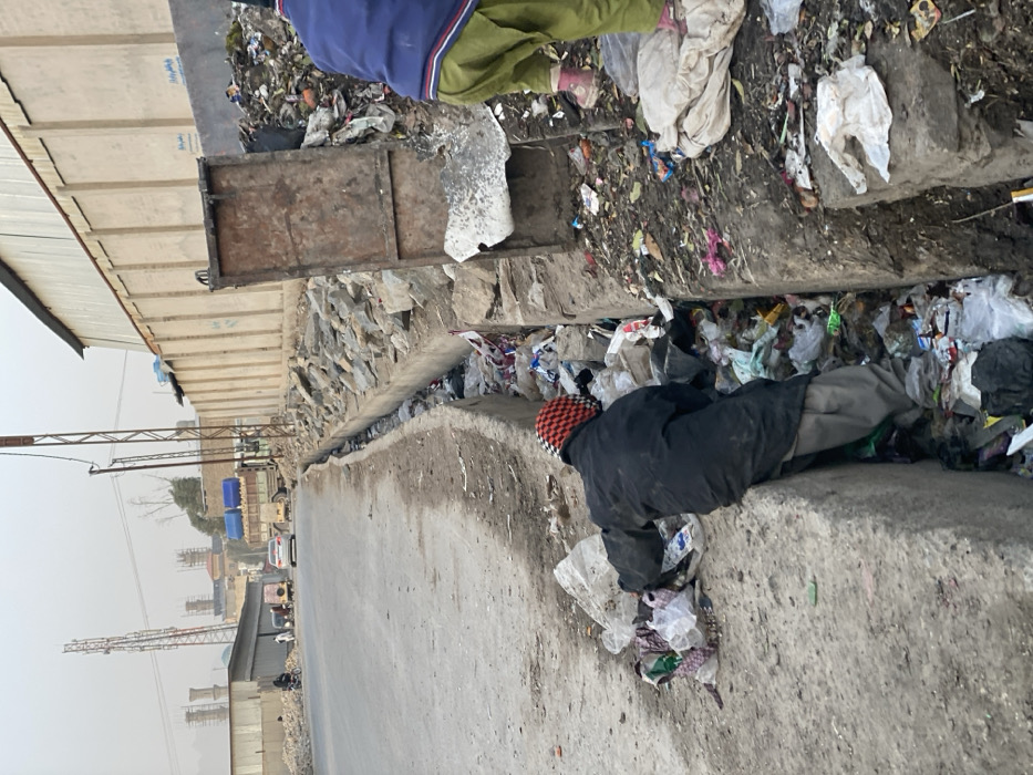The image depicts a street scene in Kandahar, Afghanistan. In the foreground, two individuals are engaged with a large accumulation of garbage. One individual, wearing a black coat, light-colored trousers, and a red and black patterned head covering, is bent over, partially immersed in a concrete drainage ditch filled with refuse. This individual appears to be sifting through the trash. To the right, another individual, visible from the waist down, wears light green trousers and pink boots, standing on a dirt embankment heavily covered with garbage, also interacting with the refuse. The concrete drainage ditch runs parallel to a paved road, which shows signs of wear and tear. Between the ditch and a tall, plain concrete wall, there is a rough terrain of scattered rocks and debris. In the midground, several vehicles are present on the road, including a white sedan, an auto-rickshaw, and a truck carrying blue cargo. Utility poles and overhead wires line the side of the road. The background reveals additional urban structures, including buildings with industrial characteristics, some under construction with visible scaffolding, and distant structures resembling a mosque with a blue dome and minarets. Communication towers are also visible against a hazy sky.