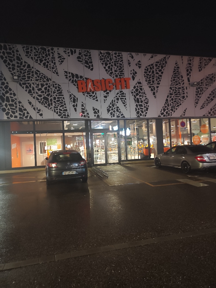 The exterior of a Basic-Fit gym at night, featuring a modern facade with a geometric pattern. Two cars are parked in front, a Renault Megane on the left and a Mercedes-Benz on the right. The entrance is illuminated, and signage is visible inside the gym. The parking lot is wet, reflecting the light from the building.