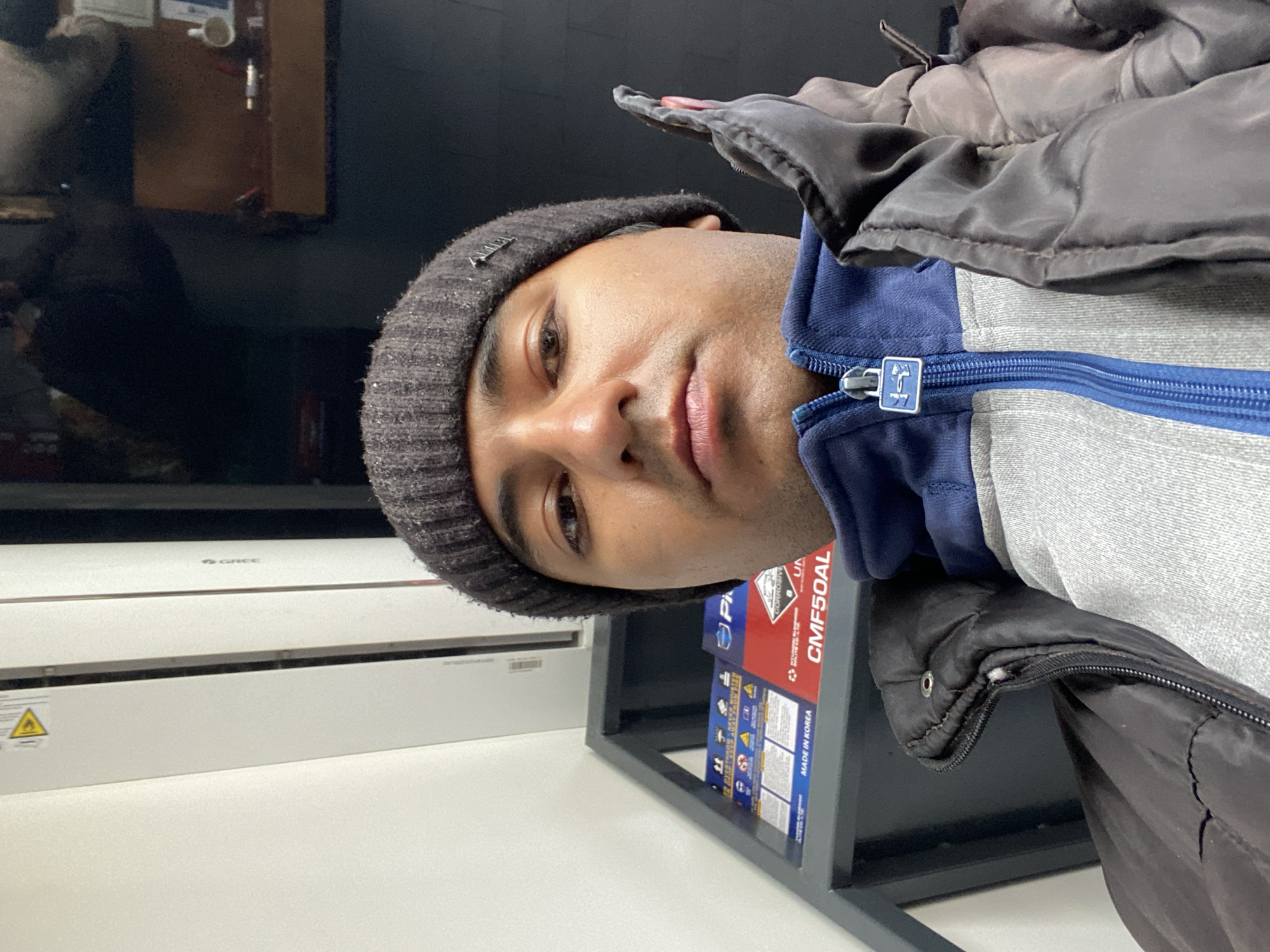 The image is a selfie of a man wearing a dark gray beanie, a gray and blue zippered top, and a dark puffer jacket