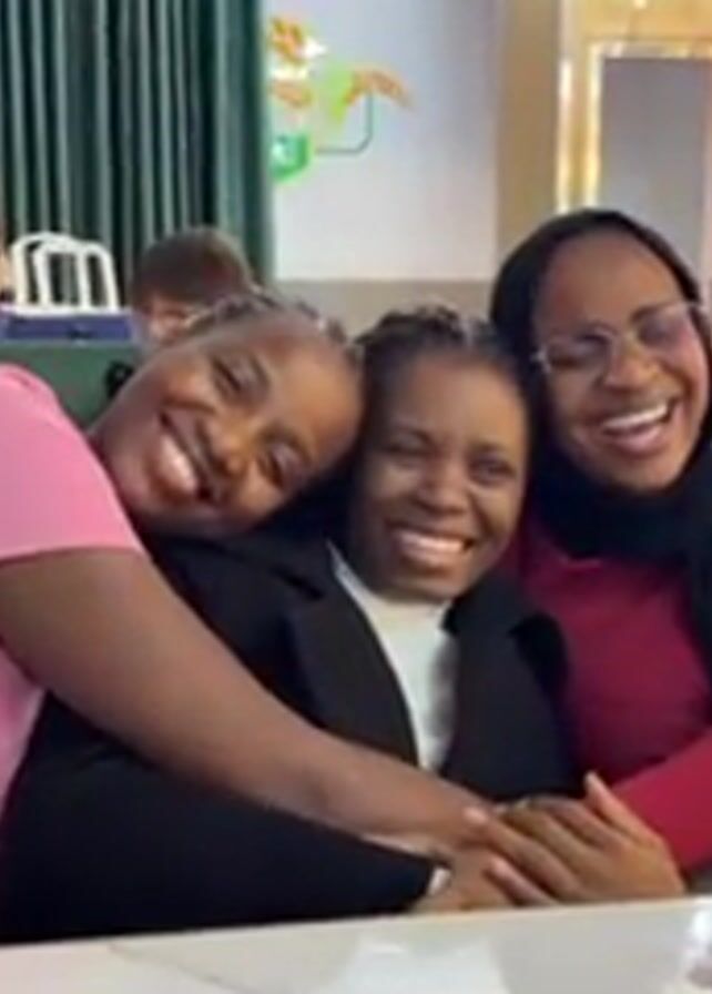 Three women, all smiling, are seated close together on a green cushioned bench inside a restaurant. The woman on the left, wearing a pink top, has her arm around the woman in the middle, who is wearing a black jacket. The woman on the right, wearing a red top and a black hijab, also has her arm around the woman in the middle. They all appear to be posing for a photo or video. A smartphone is visible on the table in front of them. In the background, other people can be seen at tables, and there are tables, chairs, and decorative elements typical of a restaurant setting. A chandelier hangs from the ceiling.