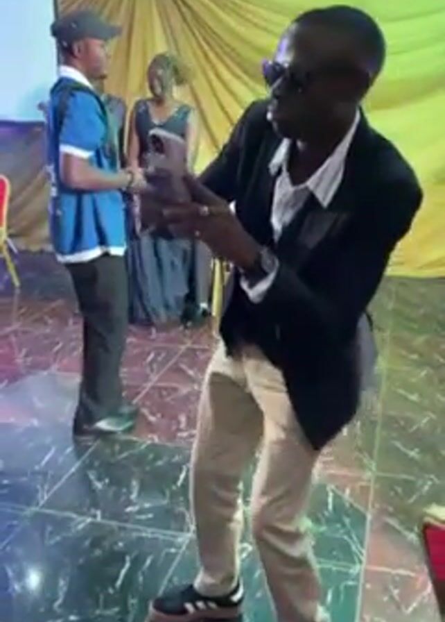 A man wearing sunglasses, a blazer, light-colored pants, and dark shoes dances and records with his cell phone in a banquet hall. Another man in a blue shirt and cap stands nearby. A woman in a black dress is visible in the background. The floor is patterned with light and dark squares. The camera falls during recording and ends up showing various blurred objects, including furniture and fabric in red, yellow, and green.