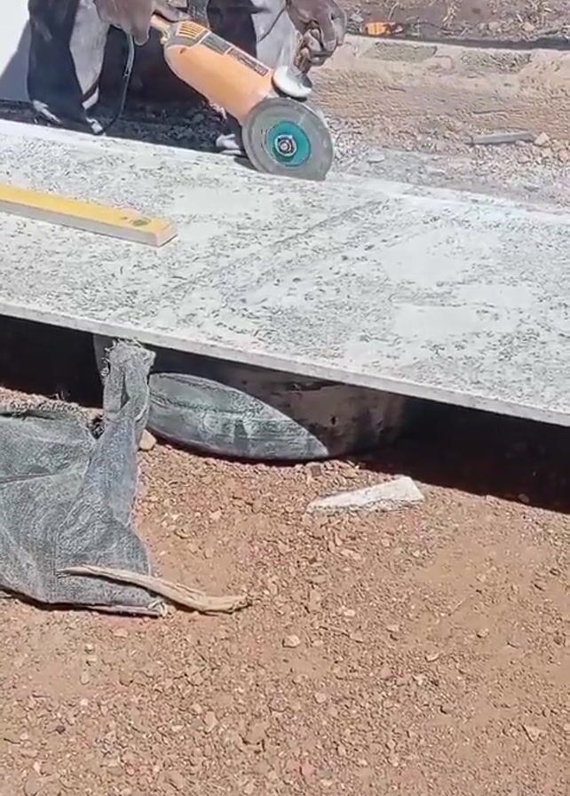 A person wearing dark clothing is kneeling and using an orange angle grinder to cut a large slab of gray and white patterned material. The slab rests over an exposed pit, with a dark gray bag and a piece of wood nearby. A yellow level lies on the slab. Dust rises from the point of cutting. The ground is covered in small reddish-brown pebbles. A wire stretches out in the background.