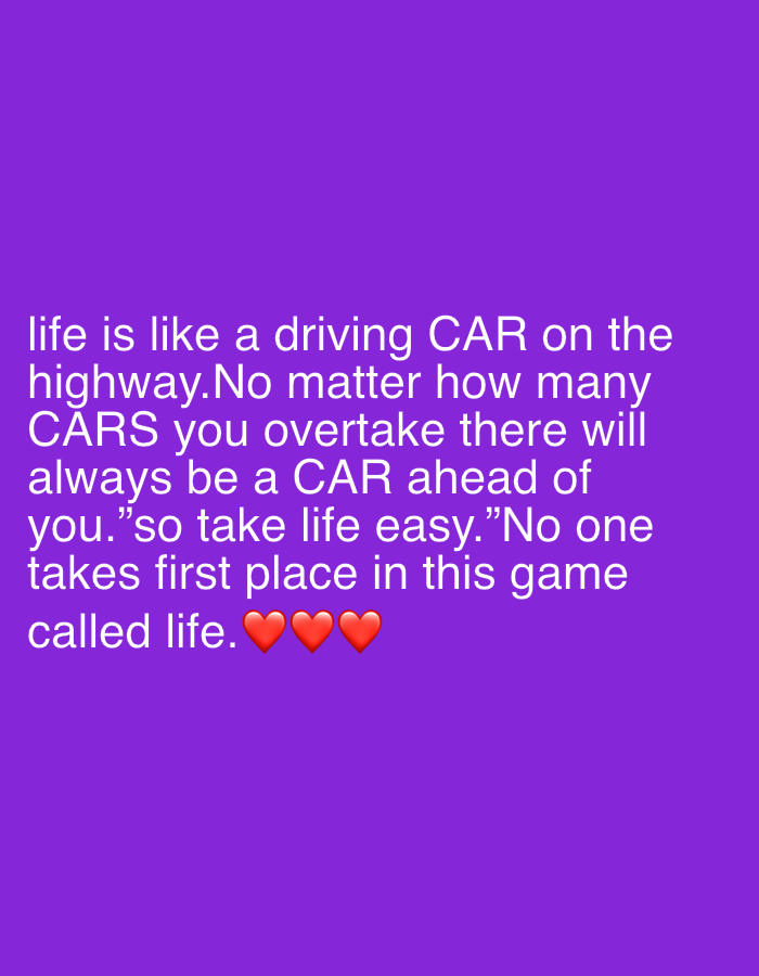 The image displays white text against a solid purple background. The text reads: "life is like a driving CAR on the highway.No matter how many CARS you overtake there will always be a CAR ahead of you.”so take life easy.”No one takes first place in this game called life." Below the text are three red heart emojis. No people, physical objects beyond the text and emojis, or specific actions are depicted. The environment consists solely of the digital purple background. There is no visual information within the image to determine a physical location in the city of Ikota, Nigeria, or any other geographical area.