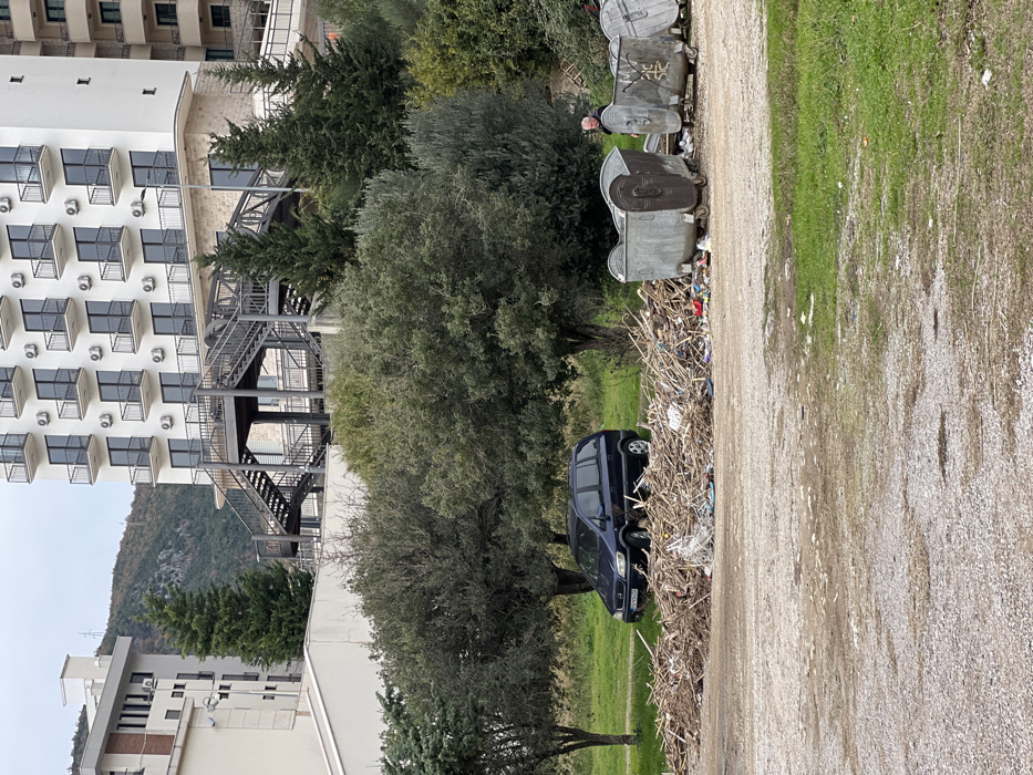 The scene in Boreti, Montenegro, depicts an outdoor area under an overcast sky. The foreground consists of unpaved, gravelly ground with intermittent patches of green grass. In the midground, a substantial pile of wooden sticks, branches, and mixed plastic/fabric debris is situated towards the left. Immediately behind this debris, a dark blue Opel Zafira minivan, bearing Greek license plate XAM 2635, is parked on a grassy expanse. To the right of the debris pile, a line of three large, grey, wheeled metal waste containers are positioned on unpaved ground. An adult male, with light-colored hair and wearing a dark jacket, stands with his back partially to the viewer, facing the waste containers on the far right. Multiple deciduous trees with dark green foliage are distributed across the midground, behind the debris pile, minivan, and near the waste containers. The background is dominated by a tall, modern white building with numerous floors, each featuring balconies with black railings and dark windows. A complex dark grey metal exterior staircase system is attached to the lower levels of this building, which has a stone-clad base. To the left of the main white building, another lighter-colored building is partially visible. A forested mountain range forms the distant backdrop.