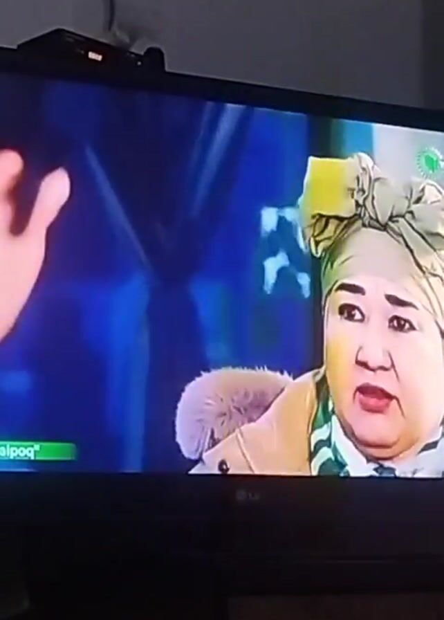 television screen displaying a scene. Initially, a woman with a head wrap and a concerned expression is visible. Then, the screen focuses on a young man with dark hair and a mustache, wearing a light-colored shirt. He appears to be speaking, or possibly an actor in a scene. The background is a blue and white gradient. The television is black and has a device sitting on top. The text "Qalpoq" is visible on the bottom left of the screen.
