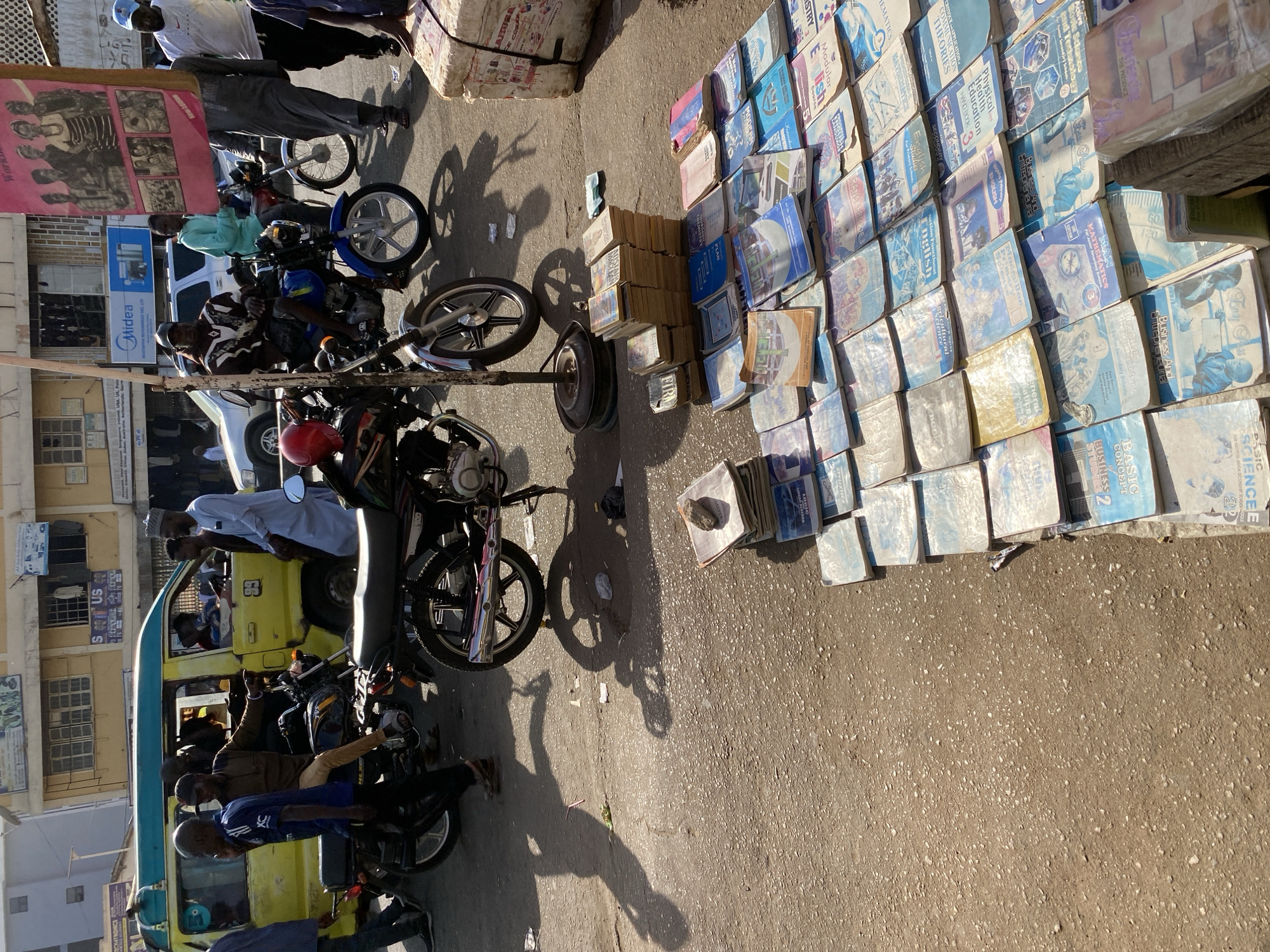 The image depicts a bustling street scene in Maiburiji, Nigeria, characterized by vehicular and pedestrian traffic alongside a street vendor. In the foreground, numerous secondhand books are spread across the dusty ground, forming an impromptu stall. These books, varying in color and size, include textbooks on subjects like Mathematics, English, Business, and Science, with some stacked in small piles. A rock rests atop one stack. A metal motorcycle stand with a round base is positioned near the books. To the immediate right, a stack of large, packaged goods or items, secured with white strapping, is visible. In the midground, a collection of motorcycles, commonly used for transport, are parked or in motion. One black motorcycle in the foreground has a red helmet resting on its seat. Further back, a blue motorcycle is occupied by a man wearing a brown and white patterned jacket over shorts. Another man in a light blue long-sleeved shirt is seated on a dark motorcycle behind him. A yellow passenger van, marked with "99" on its side, is central to the midground, with multiple individuals congregating around and inside it. Several men are visible walking or standing; one man in a light blue traditional garment is walking leftwards from the van, and another in a dark blue shirt with an "XC" logo is walking towards the left. A silver SUV is parked further down the street behind the motorcycles. The background reveals a row of multi-story commercial buildings lining the street, some painted yellow and others light grey, featuring windows and signage such as "Midea" and "TOEFL." The ground is an unpaved or worn asphalt surface, showing some scattered debris. Strong sunlight from the upper right casts long, distinct shadows of people and vehicles across the ground, indicating daytime conditions. The overall scene conveys a busy urban market and transit area.
