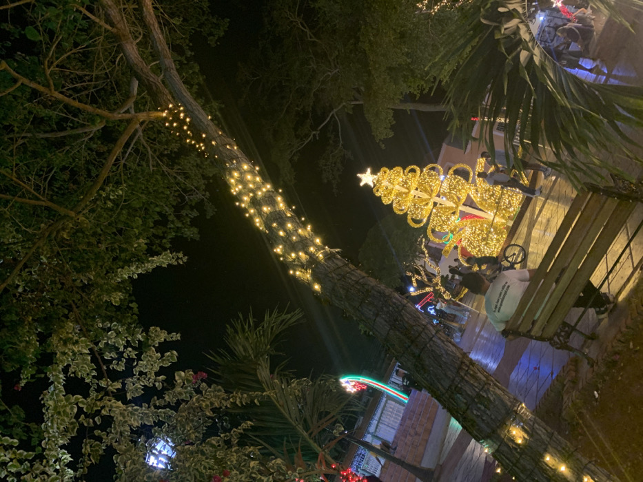 A nighttime scene captures a park decorated for the holidays. A tall tree is adorned with warm, sparkling string lights. In the background, a brightly lit Christmas tree-shaped structure with a star on top stands out. A park bench sits nearby, with people sitting on it. Various other plants and trees surround the area, adding to the festive ambiance.