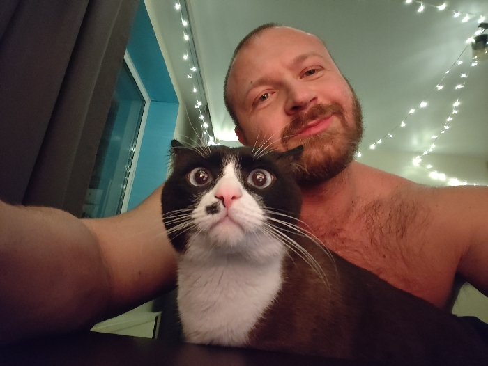 - "A shirtless man with a red beard is posing for a selfie with a black and white cat" by FM-eMutn2, licensed under CC BY 4.0