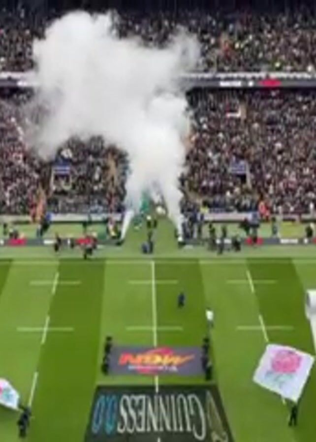 rugby stadium packed with spectators. Smoke cannons are firing as a team in green uniforms runs onto the field, likely for the start of a game. Flags bearing a rose emblem are visible on the field, along with banners for sponsors, including Guinness. The view is from a high vantage point, offering a broad view of the field and stands.