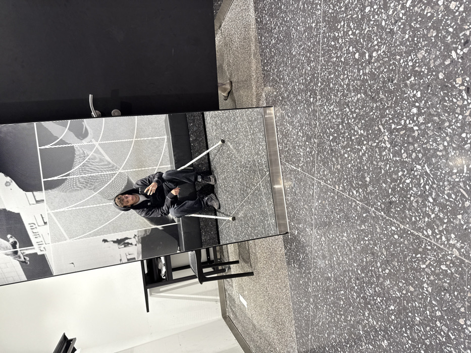 A man sits on a reflective surface with crutches, his reflection visible in a black and white patterned backdrop