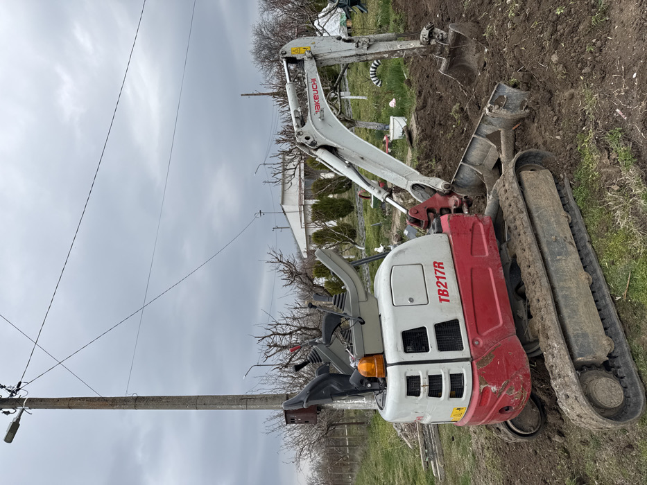 - "An outdoor scene in Polkovnik Lambrinovo, Bulgaria, depicts a white and red Takeuchi TB217R mini excavator positioned on disturbed earth under an overcast sky" by FM-g0goE2, licensed under CC BY 4.0
