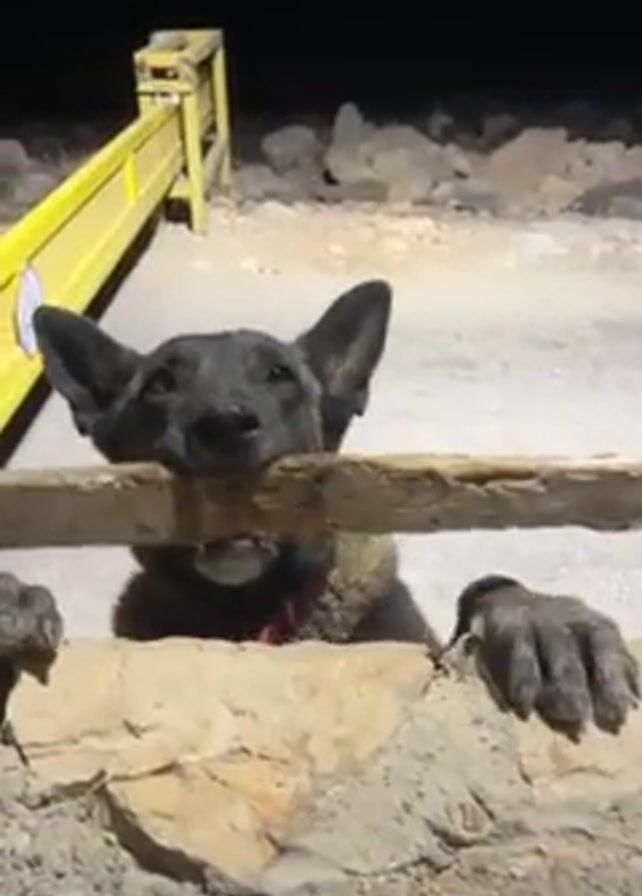 dark-furred German Shepherd type dog, illuminated by an unknown light source in the otherwise dark scene, peering over a low rock and concrete wall. The dog has a stick-like piece of wood in its mouth, which it drops, then licks its nose. Behind the dog, a yellow gate-like structure is seen. The environment appears to be outdoors, potentially a rural or semi-rural area. The ground is dirt and rock.