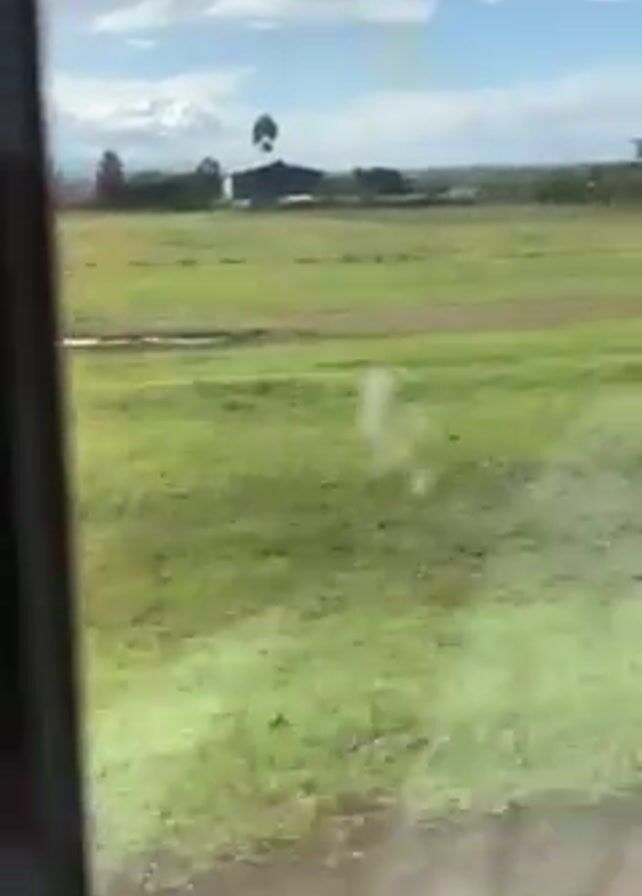 From a moving vehicle, likely a bus, a flat grassy landscape is visible through the window